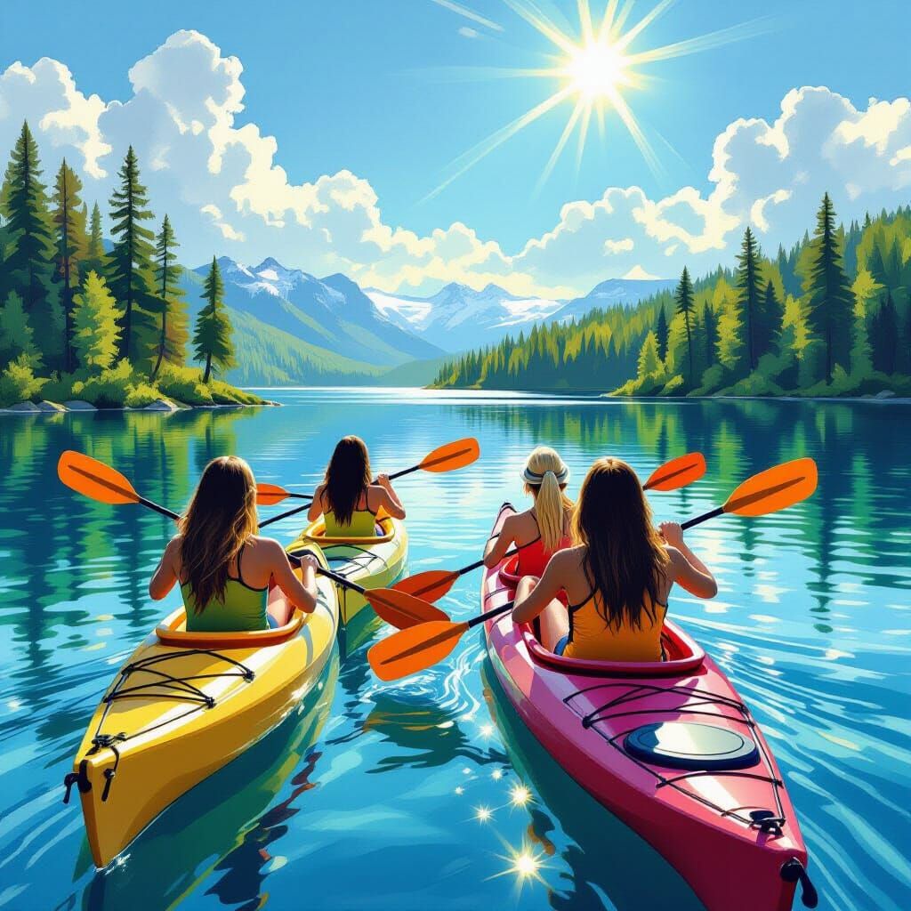 This image shows four women joyfully kayaking on a calm lake. The scene features clear water, green trees, a blue sky, and bright sunlight, rendered in a detailed matte painting style with vibrant colors.