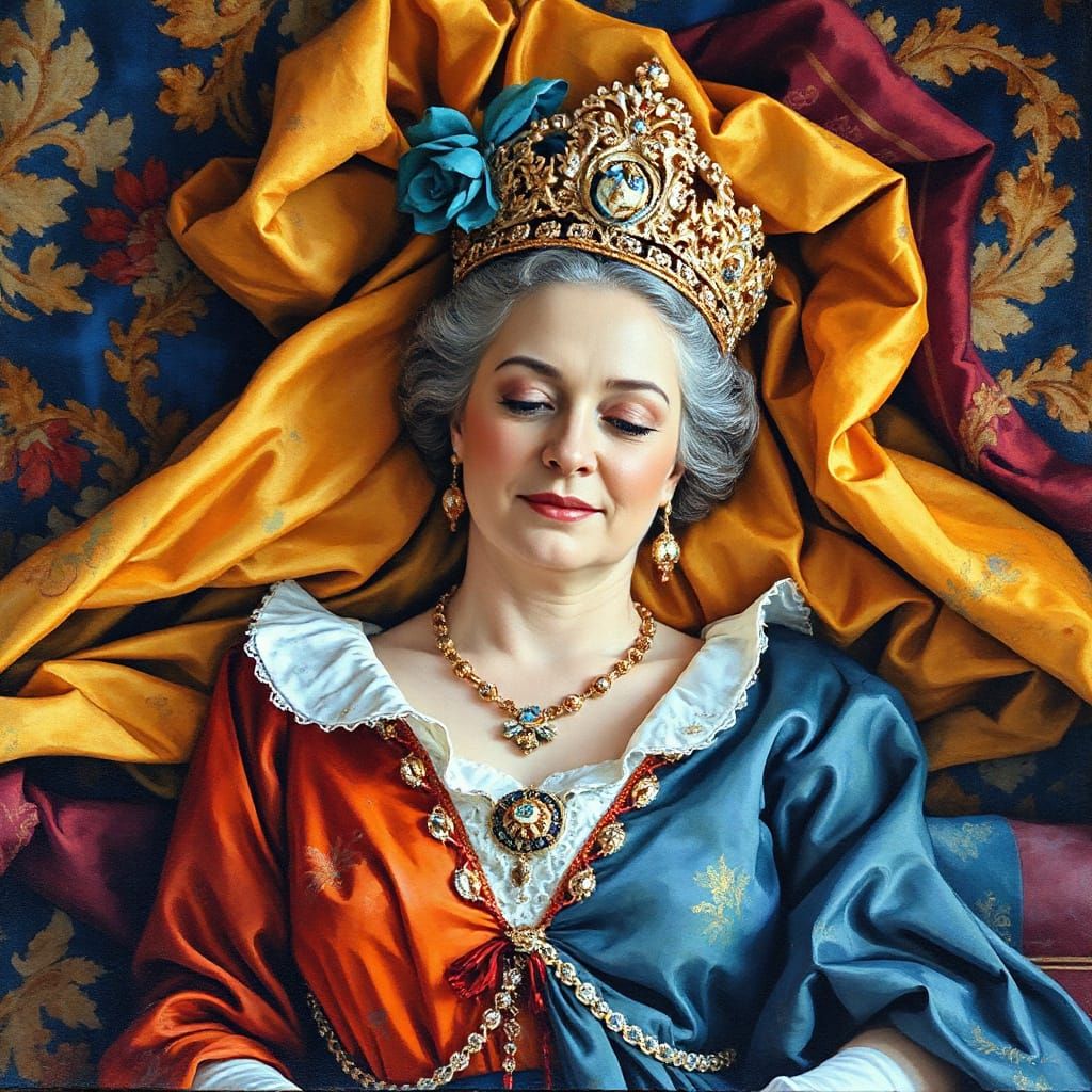 A poignant image of a deceased queen in state, surrounded by rich fabrics. The artwork is rendered in a gouache and watercolor style, with impasto brushstrokes and an ethereal aesthetic.