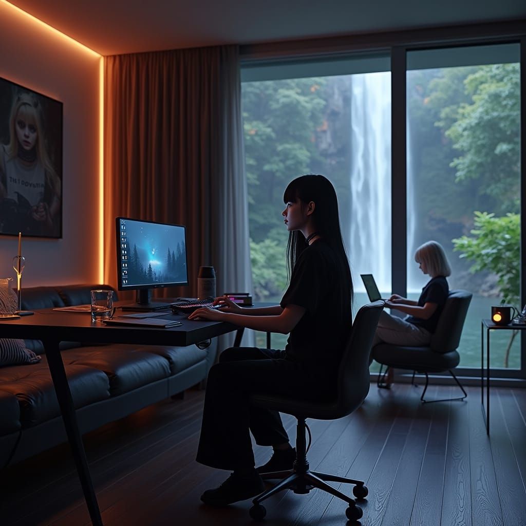 A captivating nighttime scene of two girls surrounded by sleek, high-tech gadgets and immersed in a cinematic atmosphere, with a serene infinity pool and lush forest in the background, set in a minimalist, black-themed space with soft ambient lighting.