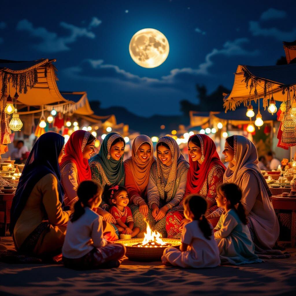 This image shows a vibrant night market scene filled with Arab women and children. The women wear colorful traditional clothing, illuminated by warm golden lighting and a full moon, in an art style reminiscent of classical Middle Eastern paintings.