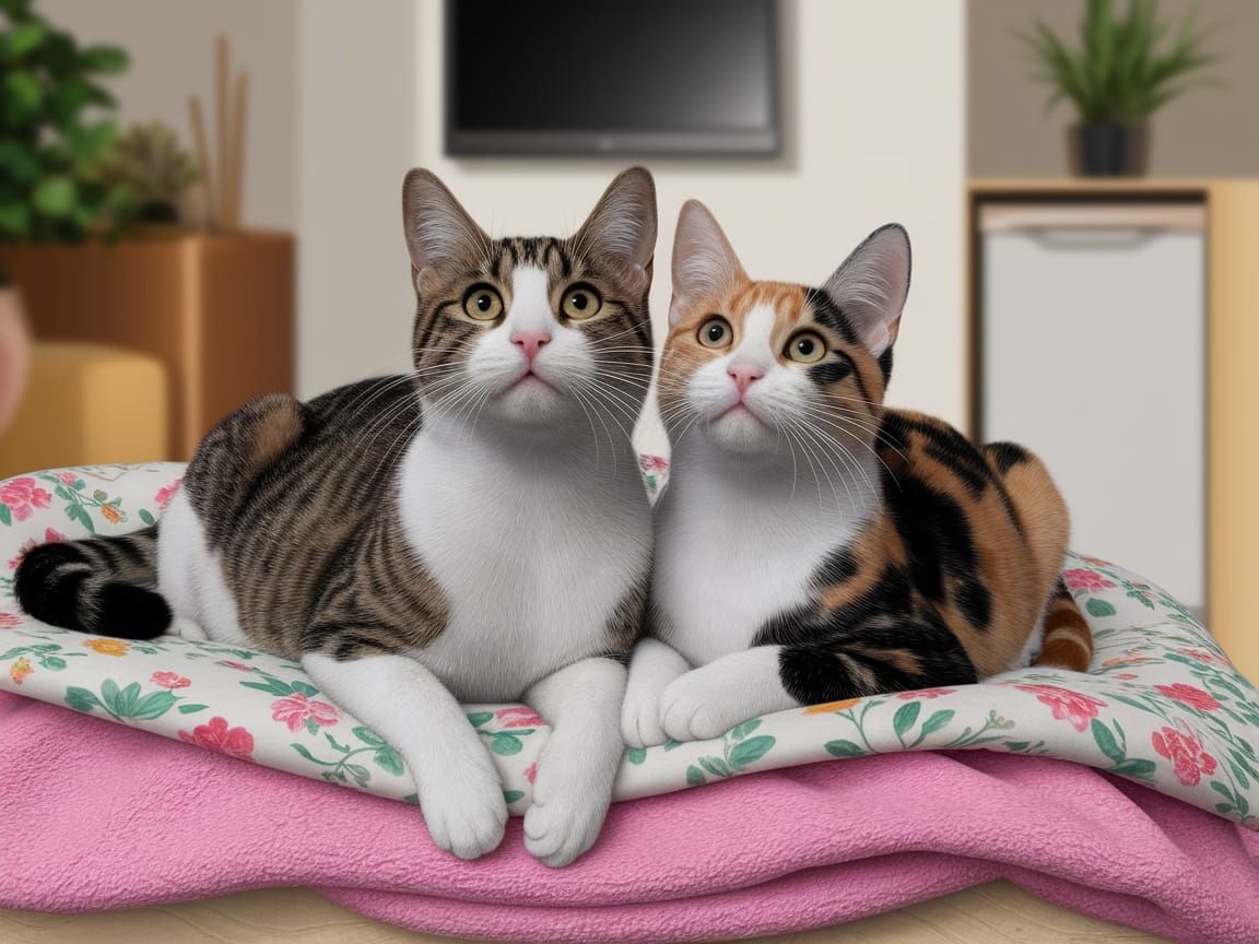 This image captures two cats lounging together on a vibrant floral blanket, surrounded by a warm and inviting home environment.