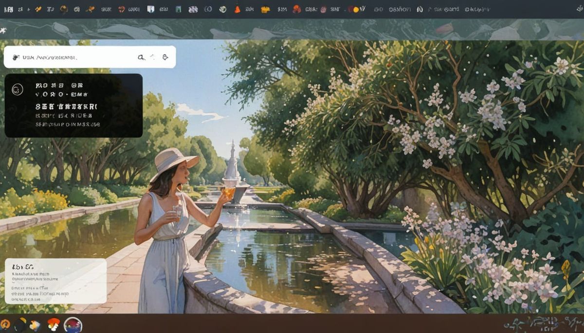 This image shows a woman drinking from a softly glowing fountain in watercolor gouache. The artwork features vibrant blooms, warm sunlight, pastel colors, and delicate textures in a dreamy, ethereal style.