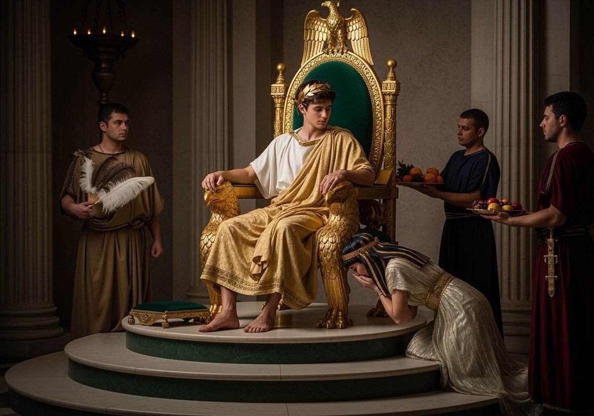 This image shows a Roman Emperor on an eagle-shaped throne as the Queen of Egypt kneels before him. Servants attend to the scene in a grand palace with natural lighting, resembling a classical painting.