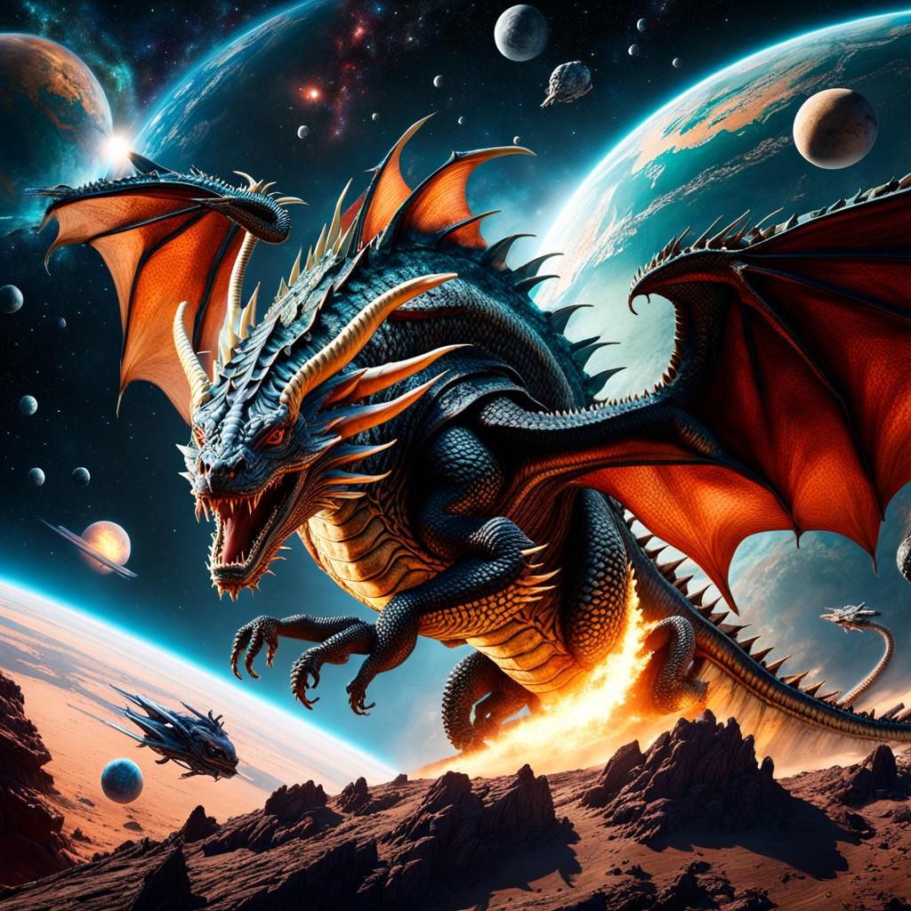 This image shows a dragon soaring through space alongside a giant turtle representing Earth. A kraken rises from Mars as Uranus splits, creating a dramatic and detailed digital matte painting.