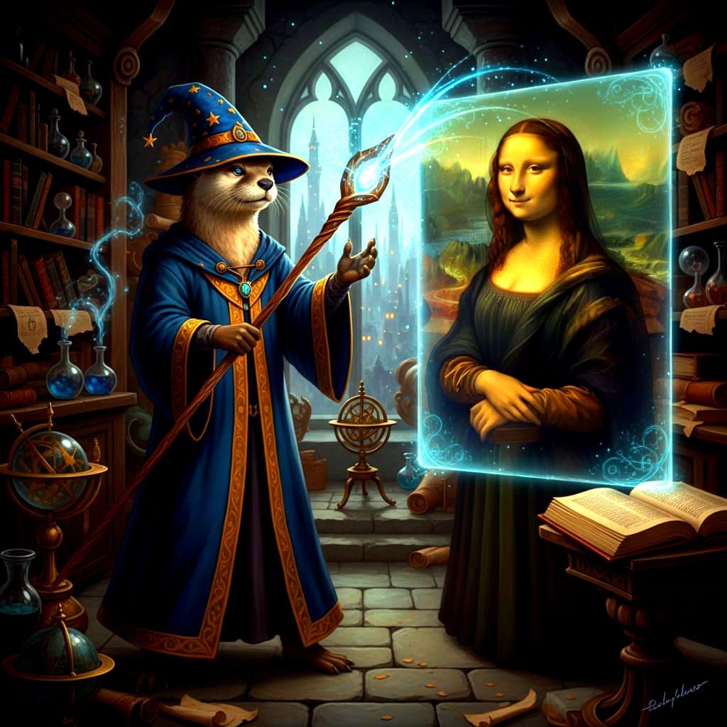 This image shows an anthropomorphic otter wizard creating a holographic portrait of a female otter, reminiscent of the Mona Lisa, with magical flair.
