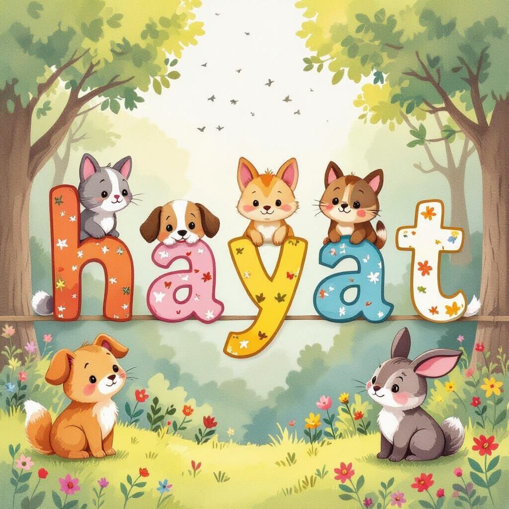 This image features the Arabic name 'Hayat' where each letter is creatively depicted as a unique, cute pet animal. Rendered in a whimsical, watercolor illustration style, it resembles a charming children's book.