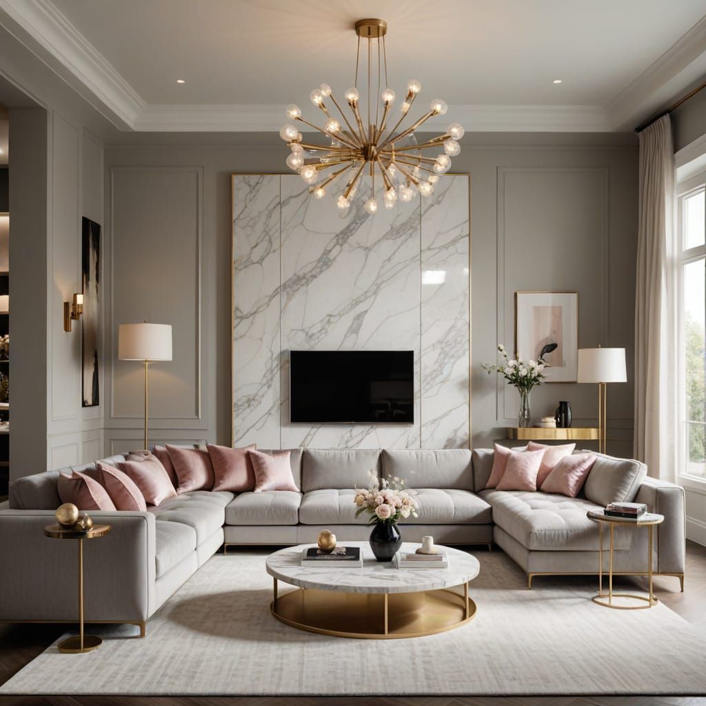 This image showcases a modern luxury living room. It features a light gray channel-back sectional, a white marble and gold coffee table, and metallic accents with soft golden lighting.