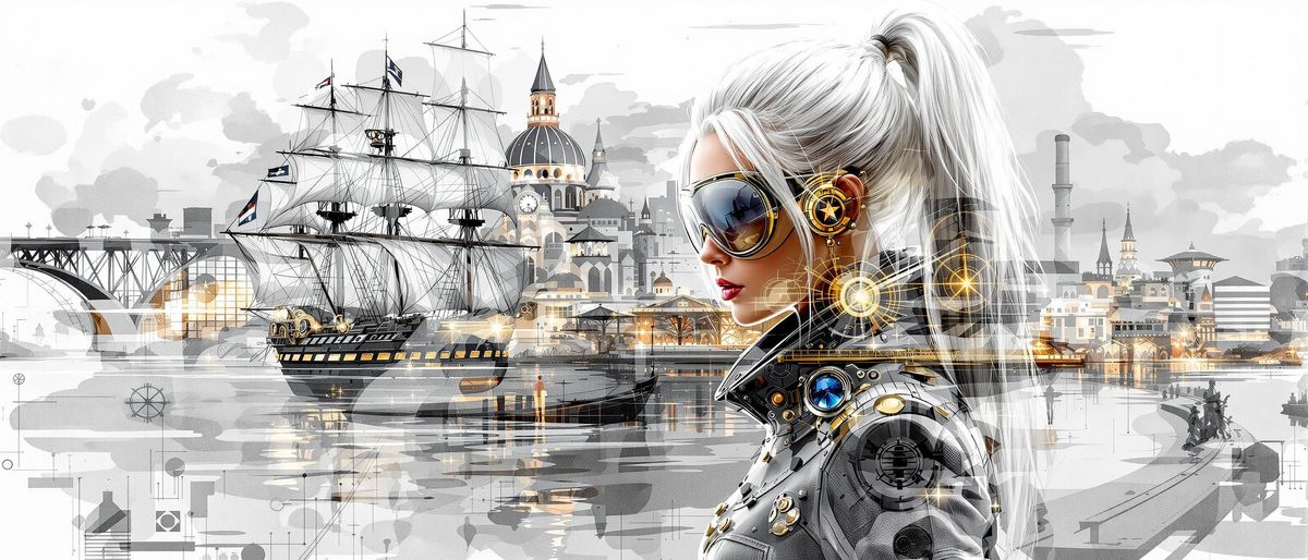 The mix of futuristic tech and the old sailing ship is amazing ๐โตโ๏ธ Her cyberpunk look against that detailed city background tells a story of two eras colliding. Love the sharp contrasts and the atmosphere you created โ stunning work! ๐โจ