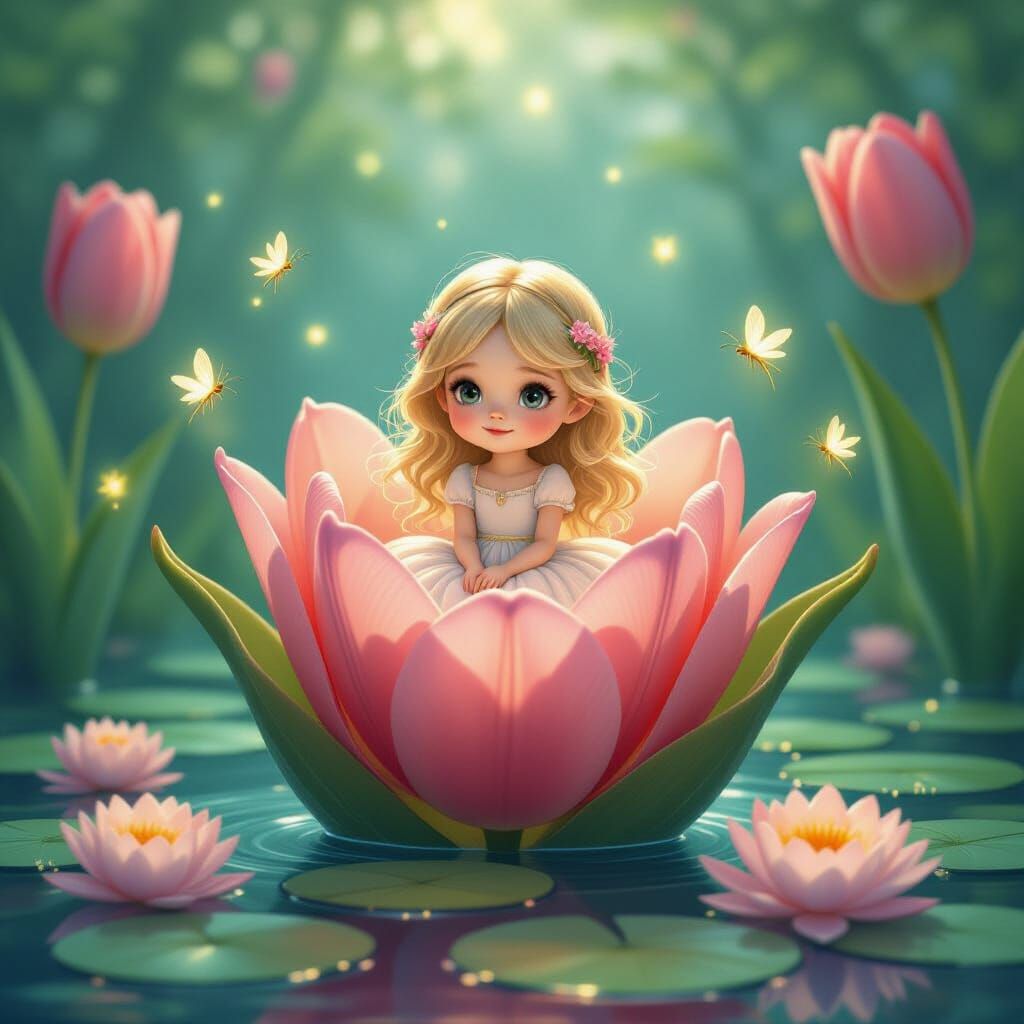 A tiny golden-haired girl sits in a blooming tulip, surrounded by glowing fireflies in a magical forest. This dreamy illustration features soft pastels and cinematic lighting.