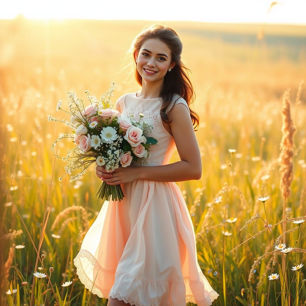 This image shows a young woman in a soft pink vintage dress, surrounded by vibrant wildflowers in a sun-drenched meadow, captured in a dreamy, impressionistic style reminiscent of Monet and Renoir.