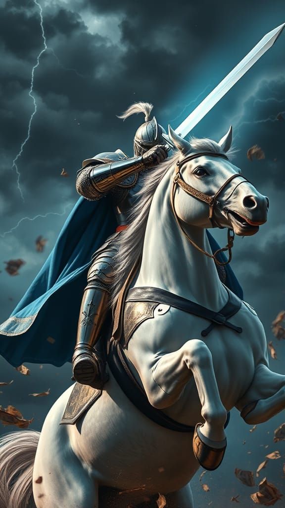 A highly detailed, realistic image of a medieval knight in silver armor with gold accents, atop a white horse during a stormy night. The knight wields a glowing sword as lightning flashes.