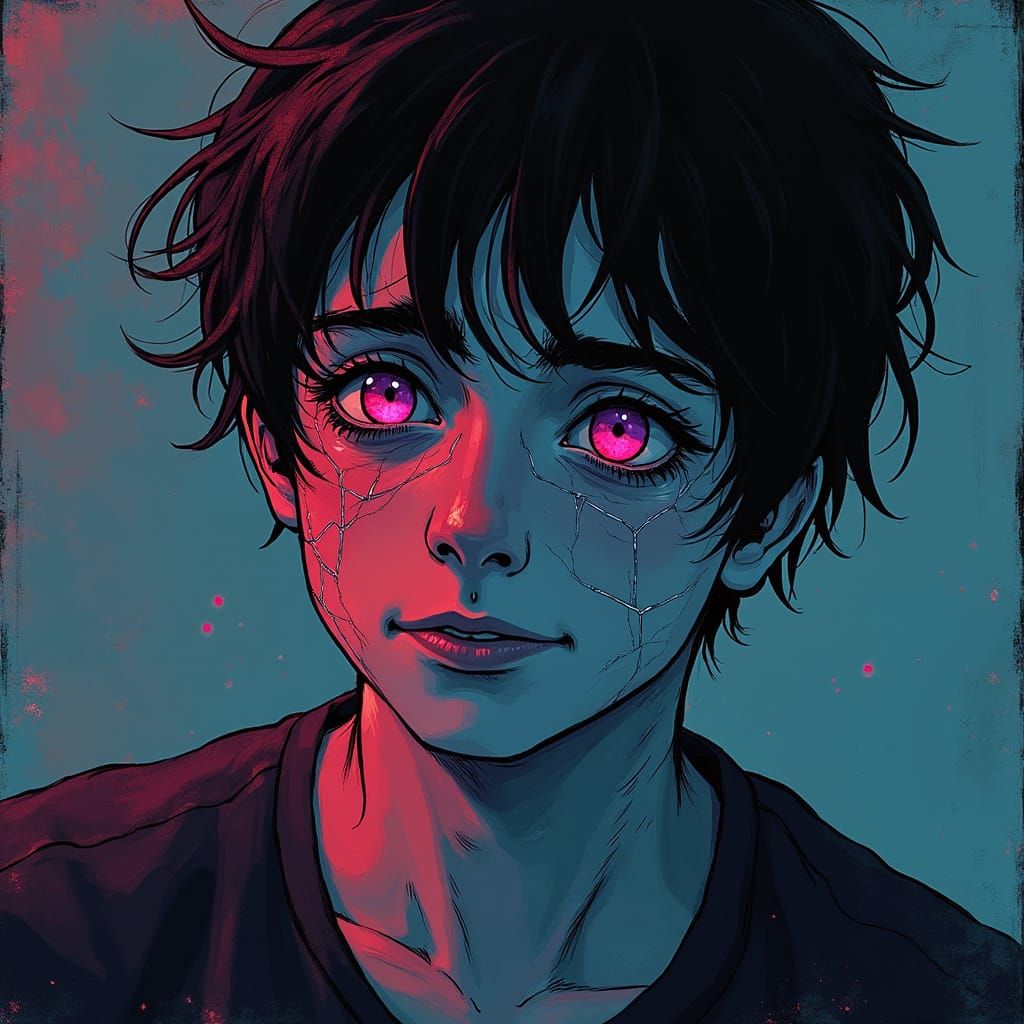 A portrait of a young man with a fractured face, a faint smile, and melancholy eyes. The artwork features an expressive ink style, dramatic shadows, and glowing violet and red eyes.