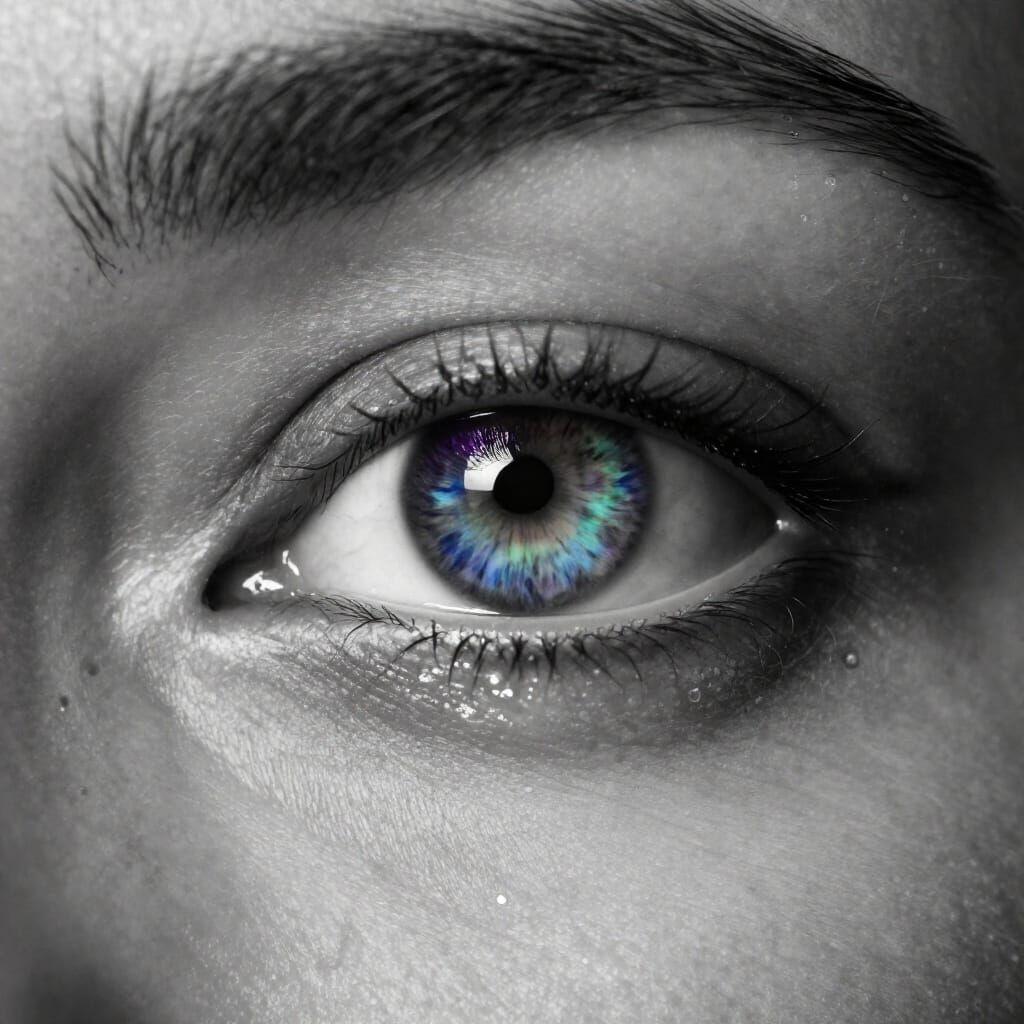 This image shows a close-up, dramatic black and white photograph of a woman's eye filled with tears. The iris displays a surreal mix of blue, purple, and green colors, captured with photorealistic detail and cinematic lighting.