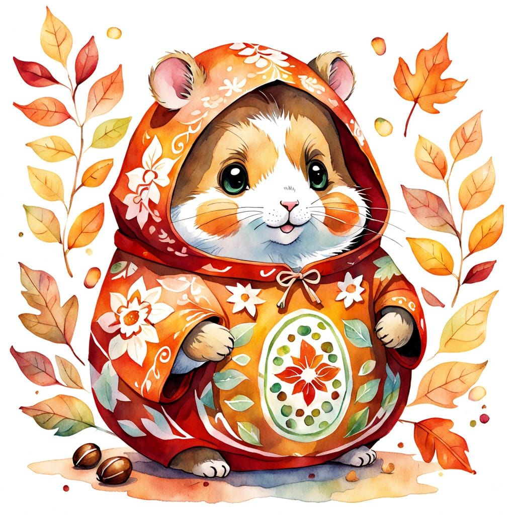 This charming watercolor illustration features a hamster cub nestled inside a stylized matryoshka doll, surrounded by autumn leaves and acorns. The soft, feathery brushstrokes and delicate patterns evoke a sense of warmth and nostalgia.