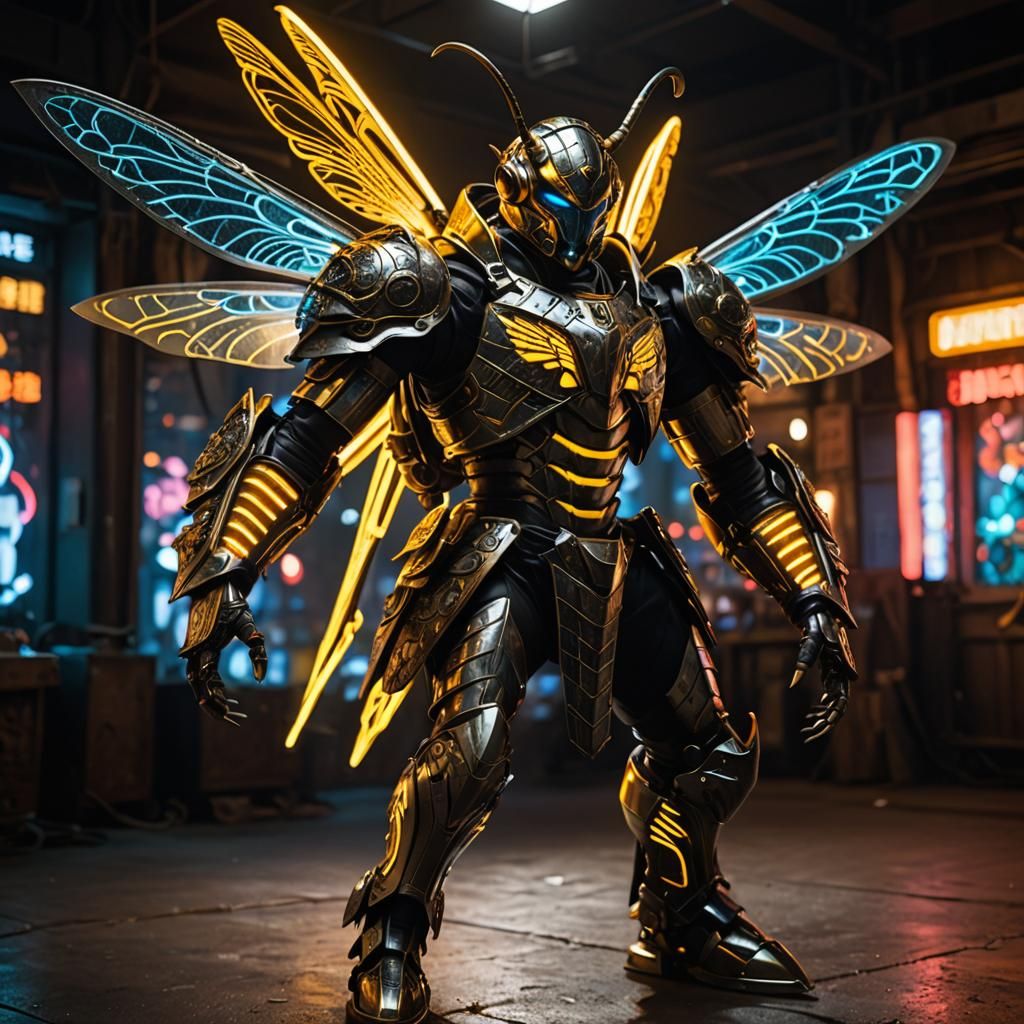 A striking picture of an enormous hornet made of dark steel and Kintsukuroi. Illuminated by neon, it carries an elf warrior into battle against ant cavalry riding wasps.