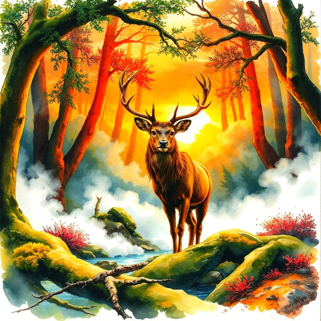 This serene image depicts a majestic stag standing proudly in an ancient woodland, surrounded by vibrant sunset hues, mossy groves, and winding streams. The artwork blends refined watercolor strokes with bold, sun-drenched colors, capturing the tranquility of nature in a captivating fusion of earthy and ...