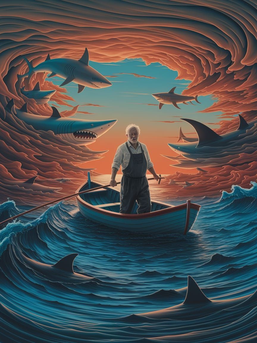 This image shows a weathered old man fighting against the forces of nature in a surreal seascape. Rich, warm hues of sunset orange and deep blues blend together in a dreamlike landscape reminiscent of surrealist art.