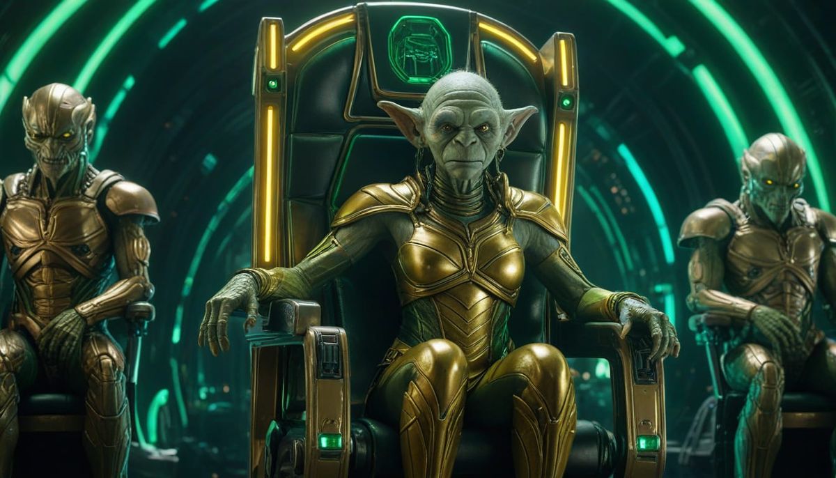 This image shows a female troll captain on her spaceship bridge. Humanoid aliens in green and gold uniforms surround her. The scene is rendered as vibrant digital art with glowing neon accents.