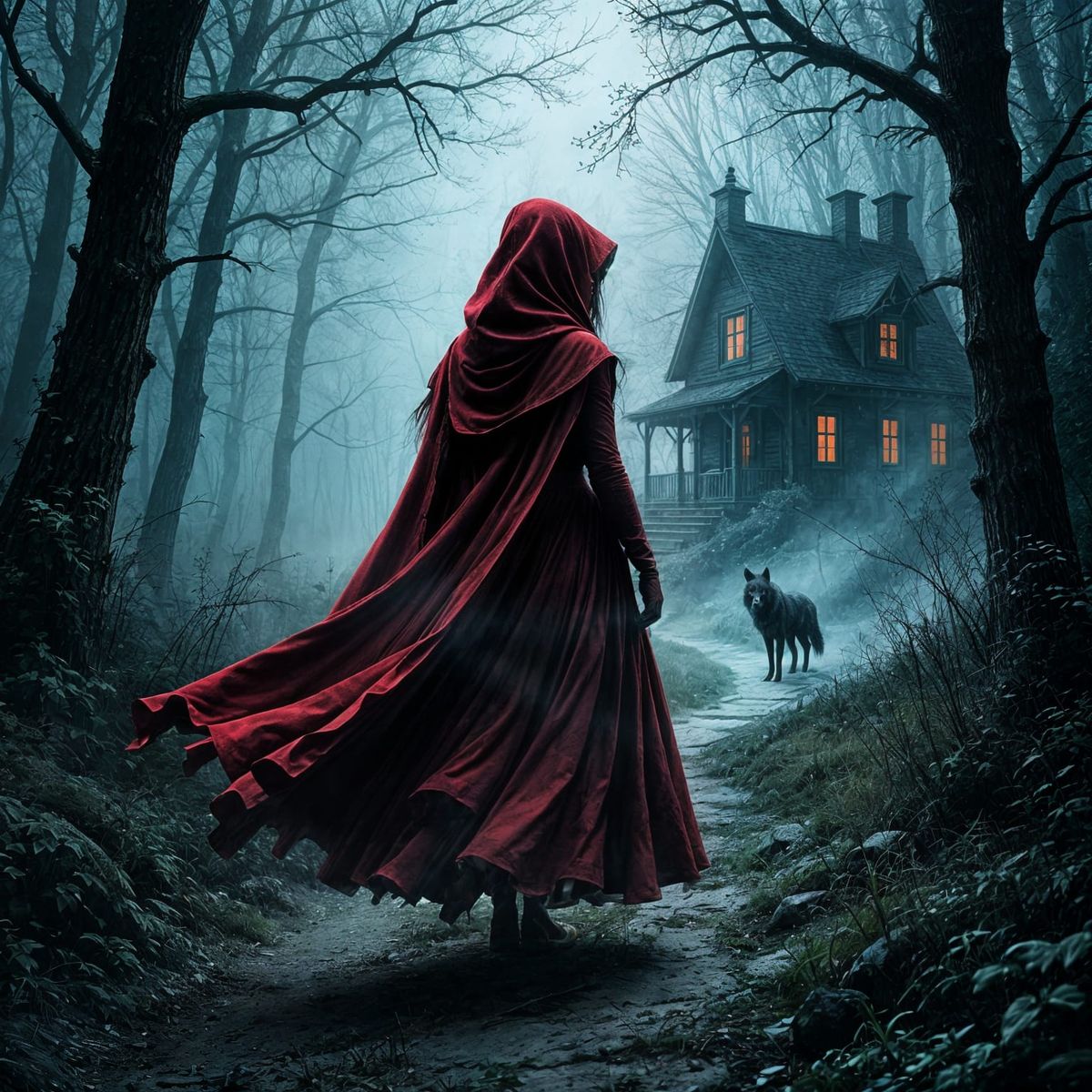 A dark fairytale portrait of Little Red Riding Hood in double exposure. Her cloak reveals a forest path, grandmother's house, and a lurking wolf. The image features dramatic lighting and painterly realism.