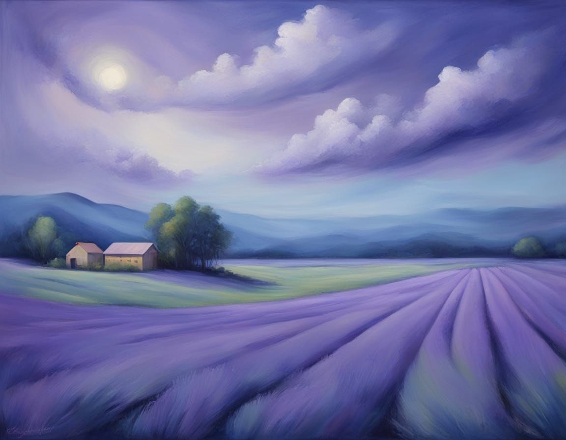 A striking abstract painting blending faded lavender and cobalt hues in a surreal, tonalist panorama. This artwork features bold brushstrokes and a dreamlike quality.