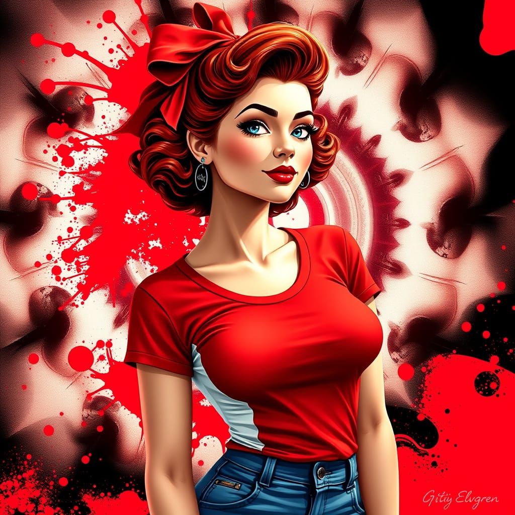 This image features a rockabilly woman with curly red hair, a red and white tee, and blue shorts, smiling coyly against a dynamic fractal backdrop with vibrant splash art. Rendered with extreme detail and realism.