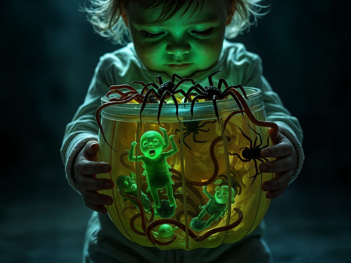 This photorealistic concept art features a toddler holding a pumpkin pail overflowing with maggots, worms, and spiders. The image uses cinematic lighting and hyperrealistic detail to create a grotesque and unsettling atmosphere.