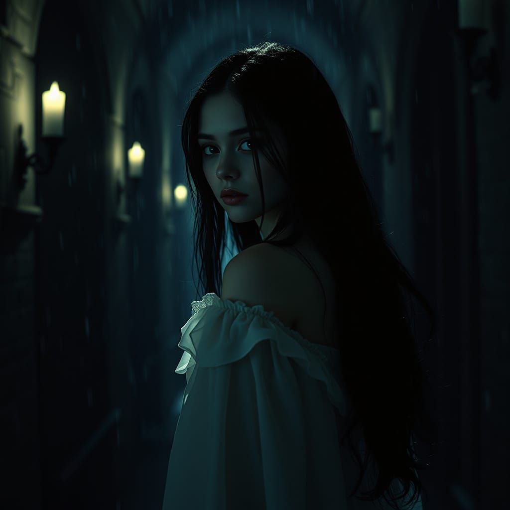 This haunting image captures a mysterious girl in a flowing white gown, illuminated by the soft glow of a candle, as she gazes into the darkness of a foreboding castle hallway, surrounded by deep shadows and an eerie ambiance, evoking a sense of foreboding and unease, reminiscent of film noir and Gothic ...