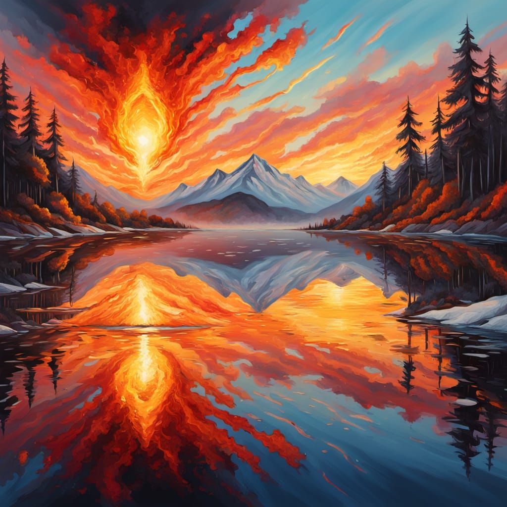 A vibrant oil painting of fire and ice stretching in opposite directions. Set against a surreal landscape featuring a sunset over a lake, the image emphasizes glowing embers and icy mist in abstract fauvist expressionism.