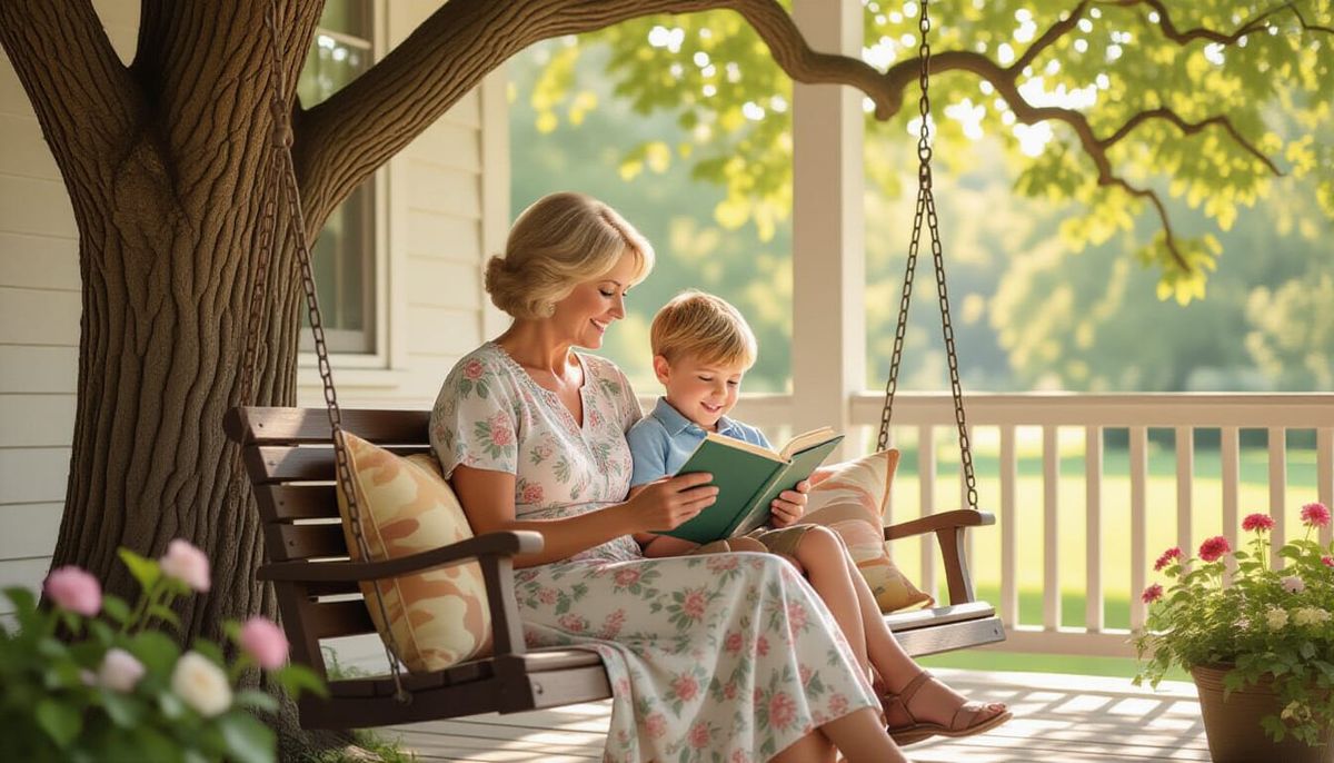A touching image of a grandmother reading to her grandson on a porch swing, bathed in gentle sunlight, rendered in a warm, impressionistic style evoking nostalgia.