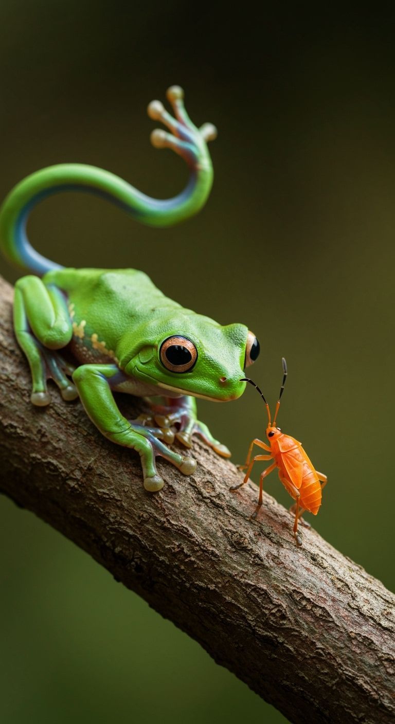 This image shows a vibrant neon green frog perched on a brown tree branch, intently watching a neon orange bug, poised to strike in this digitally enhanced wildlife scene.