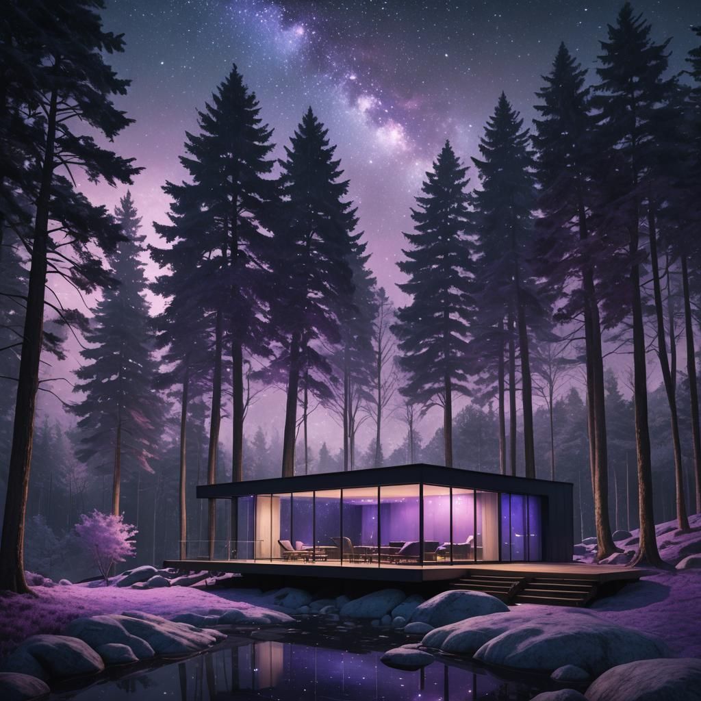 A modern glass cottage nestled in a dense forest under a starry sky. The cabin reflects the vibrant night, with soft light creating dappled shadows in this hyper-realistic digital artwork.