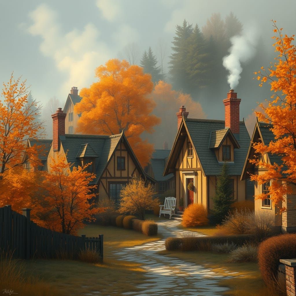 A serene depiction of a village nestled in autumnal foliage, bathed in soft, golden light. The cottages exude warmth with earthy tones, while a gentle fog adds depth to the landscape in an ultra-realistic style.