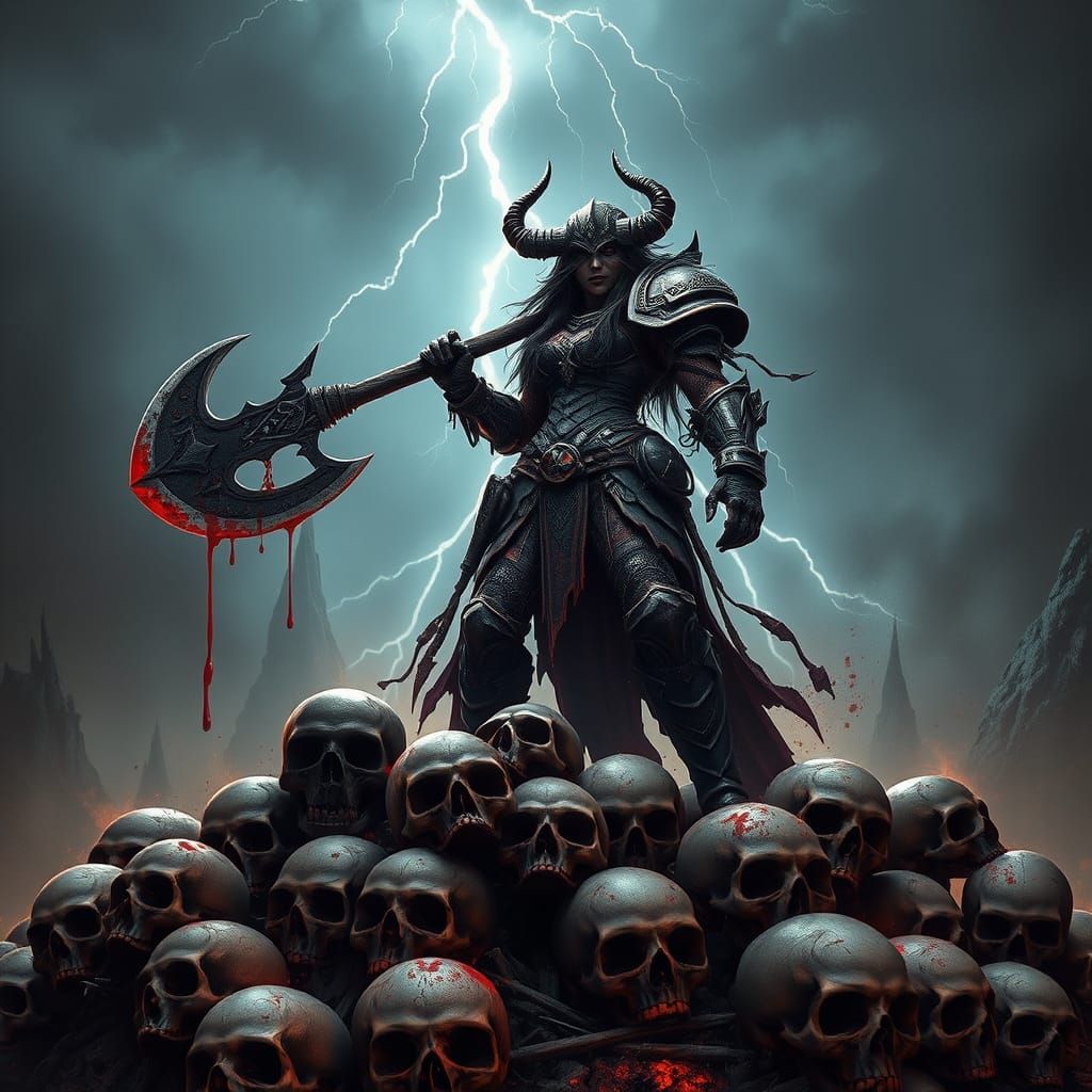 A dramatic image of an orc warrior standing on a mountain of skulls. The gritty, dark fantasy scene is rendered with dynamic lighting and intricate details in a cinematic style.