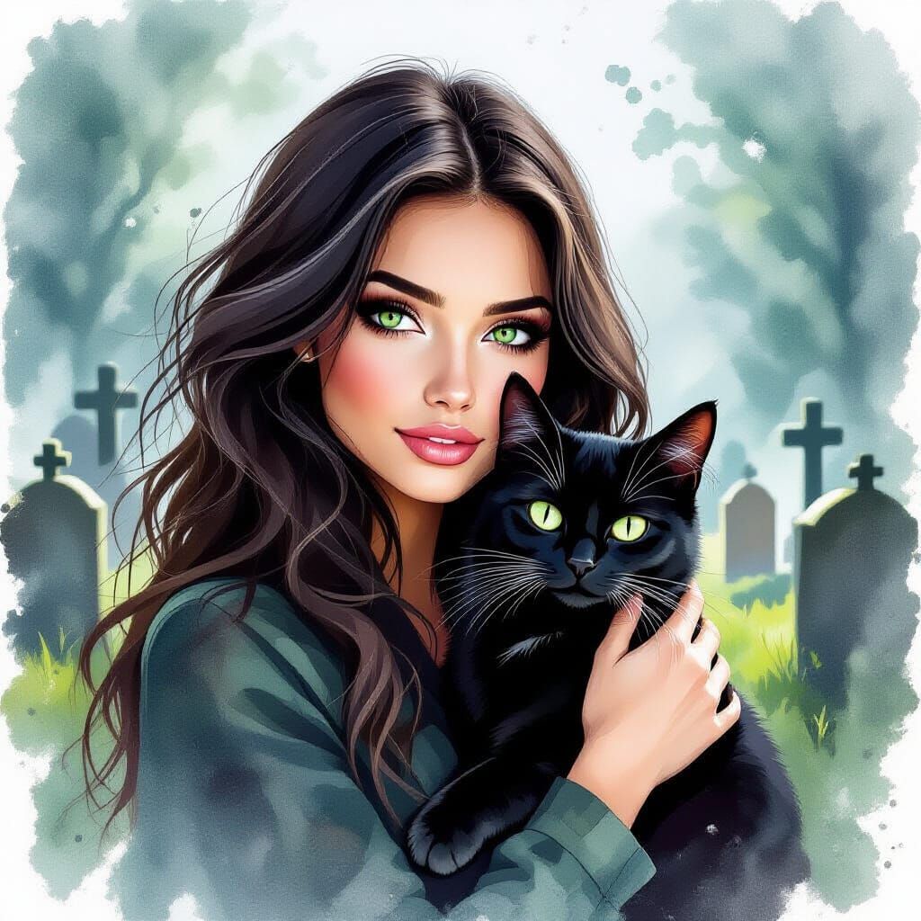 A dark-haired woman with striking green eyes cradles a black cat in a cemetery. Rendered in a watercolor style with alcohol ink splatter effects.