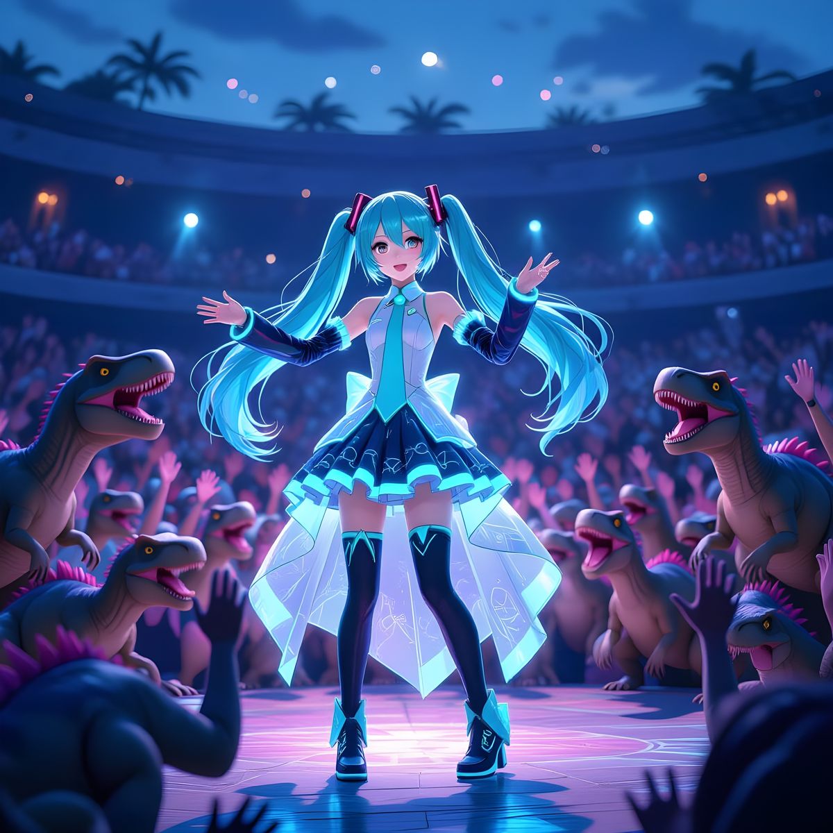 A vivid image shows Hatsune Miku performing for dinosaurs in a prehistoric setting. The scene is full of energy, with a hyperrealistic, WLOP and Artgerm-inspired aesthetic, and surreal, fantastical elements.