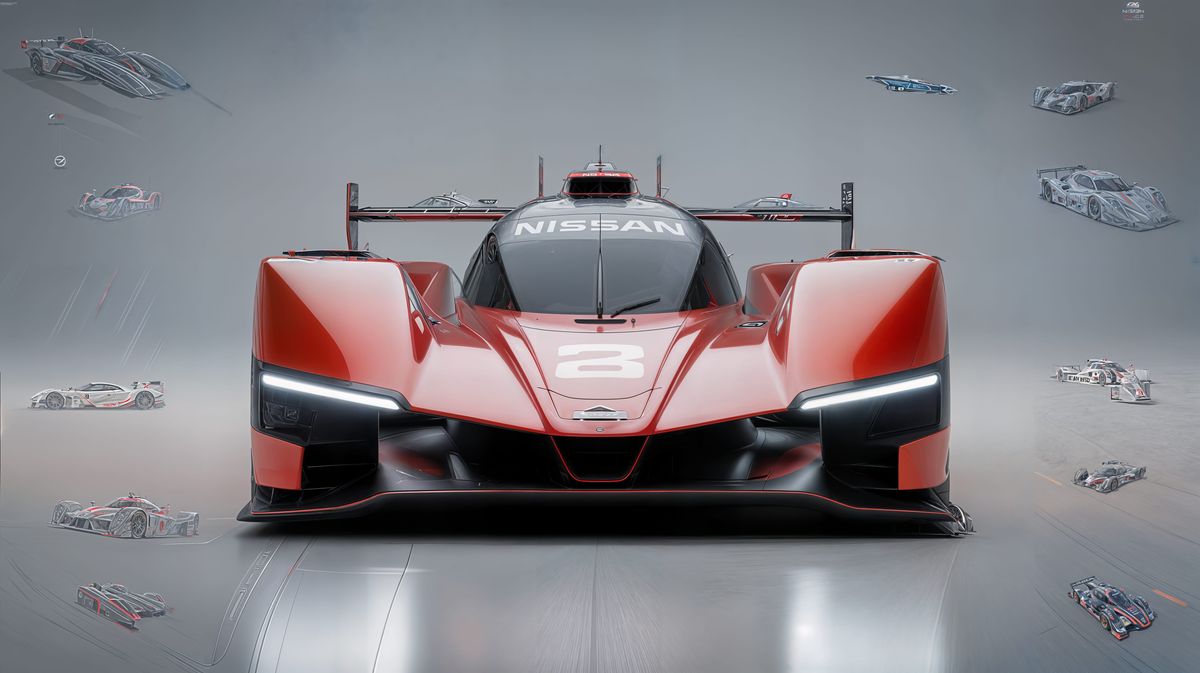 This image showcases a sleek, futuristic 2030 Nissan Vision GT LMP1 race car with sharp, angular lines. It features vibrant Nissan racing colors and a spaceship-like design, rendered in ultra-realistic 8k detail.
