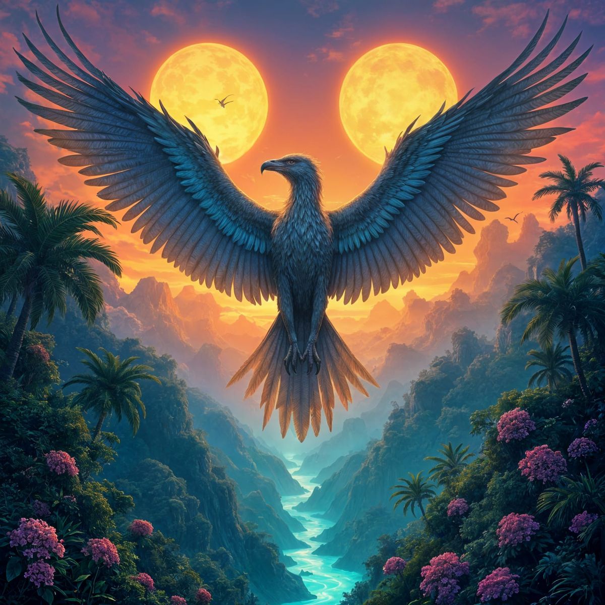 A striking picture of a griffin flying over a jungle on an alien planet. The fantastical image features vibrant colors and strange flora and fauna in an art nouveau style.