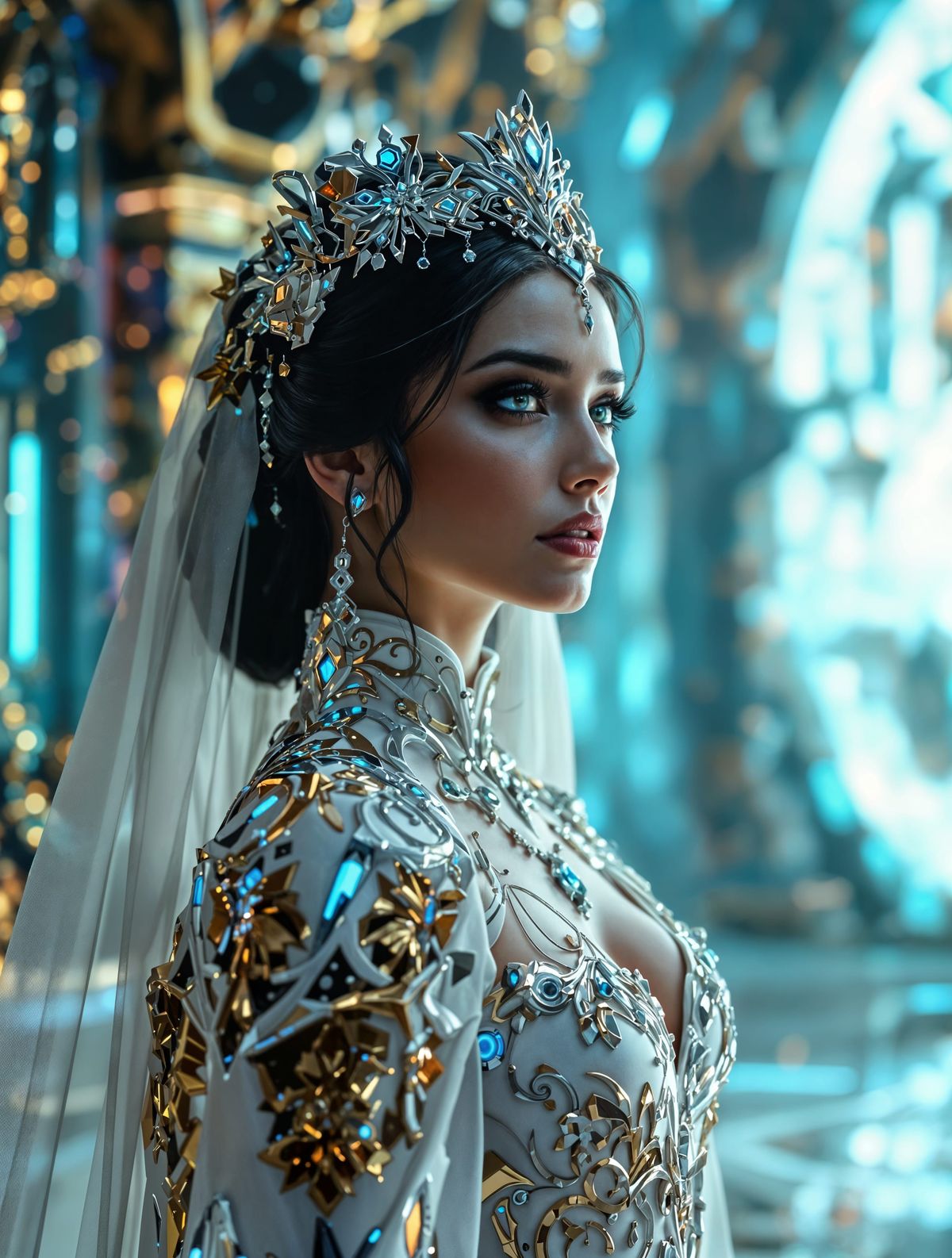 A striking picture of a beautiful Italian bride standing alone at a futuristic digital altar, surrounded by chrome and blue neon accents, with tears in her eyes, in a hypermaximalist cyberpunk aesthetic.