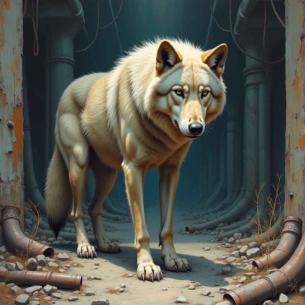A striking picture of a wolf standing in the ruins of a factory. The image is painted in gouache style with textured brushstrokes, earthy tones and a muted color palette, reminiscent of symbolic realism.