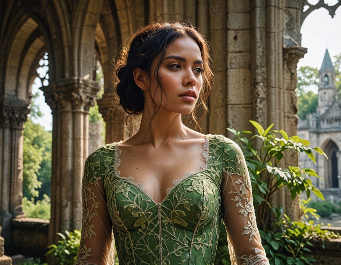 A striking picture of a Dominican woman in a ruined gothic cathedral. She wears a gown with dark floral patterns. Soft golden light illuminates her face in this highly detailed digital art.