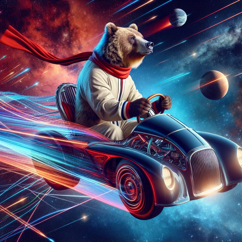 A futuristic sports car soars through a cosmic landscape. The driver is a grizzly bear wearing a racing suit and scarf. This surreal scene blends science fiction and wild nature.