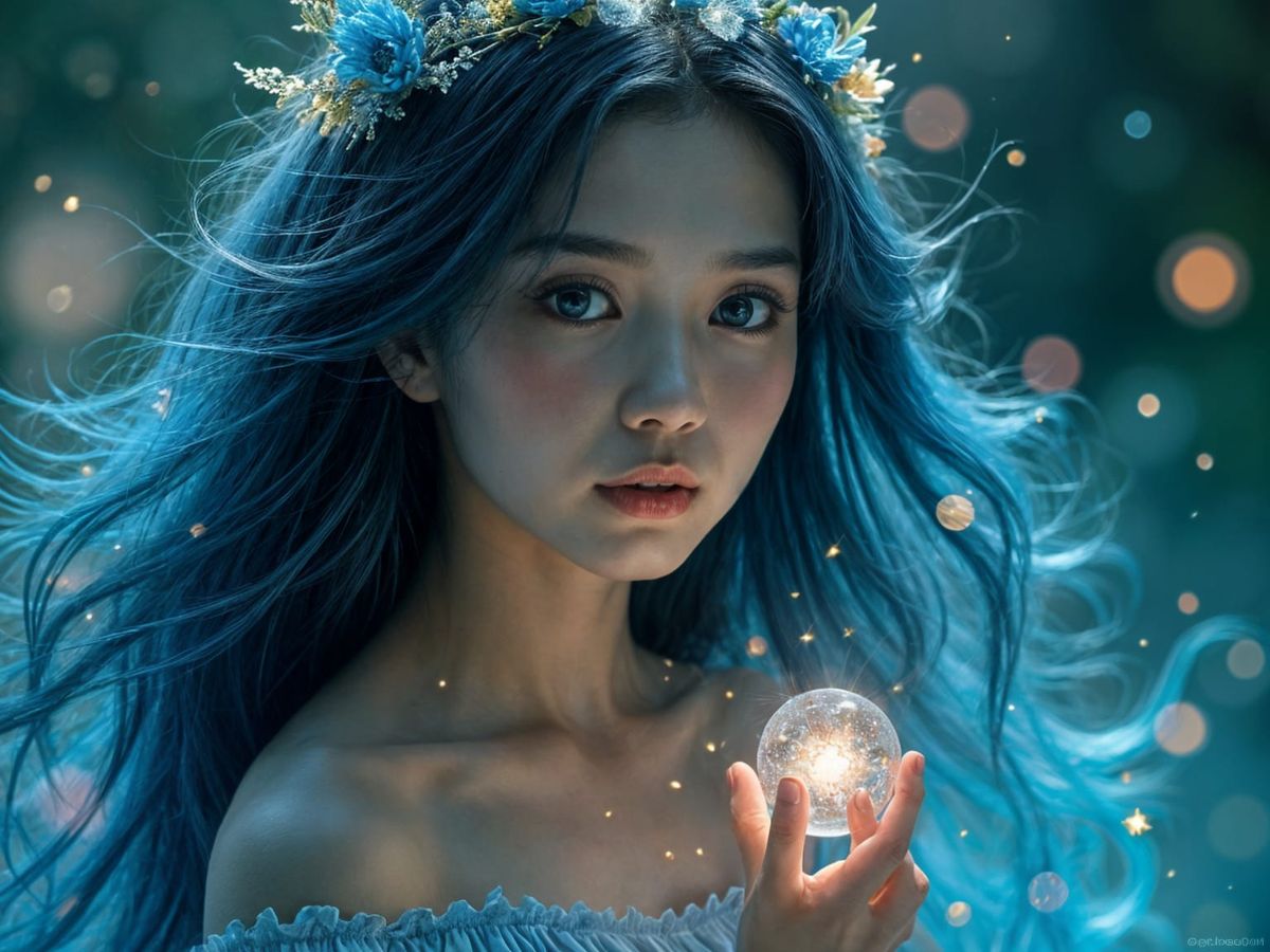 This image shows a 17-year-old girl with radiant hair, embodying wisdom and serenity, touched by melancholy. The ethereal fantasy art style features swirling dimensional rifts and winged light entities.
