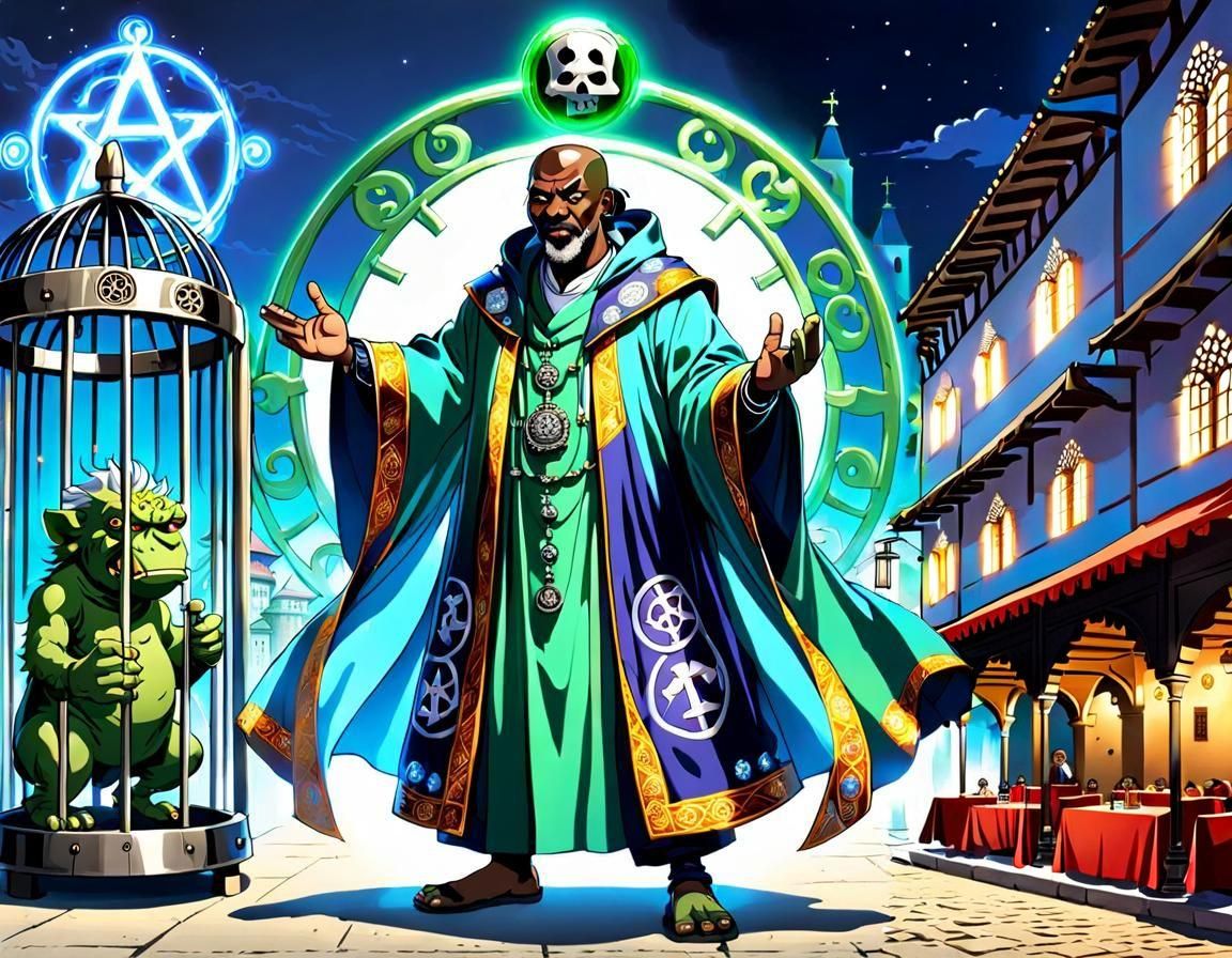 I figure this powerful wizard is the employer of a cute, hard-working secretary whom I recently featured in another anime-style creation. He's great at casting spells, capturing monsters, et cetera, but he hates to be bothered with bookkeeping and other paperwork, so his secretary will send the town council a bill and accept payment on his behalf.
