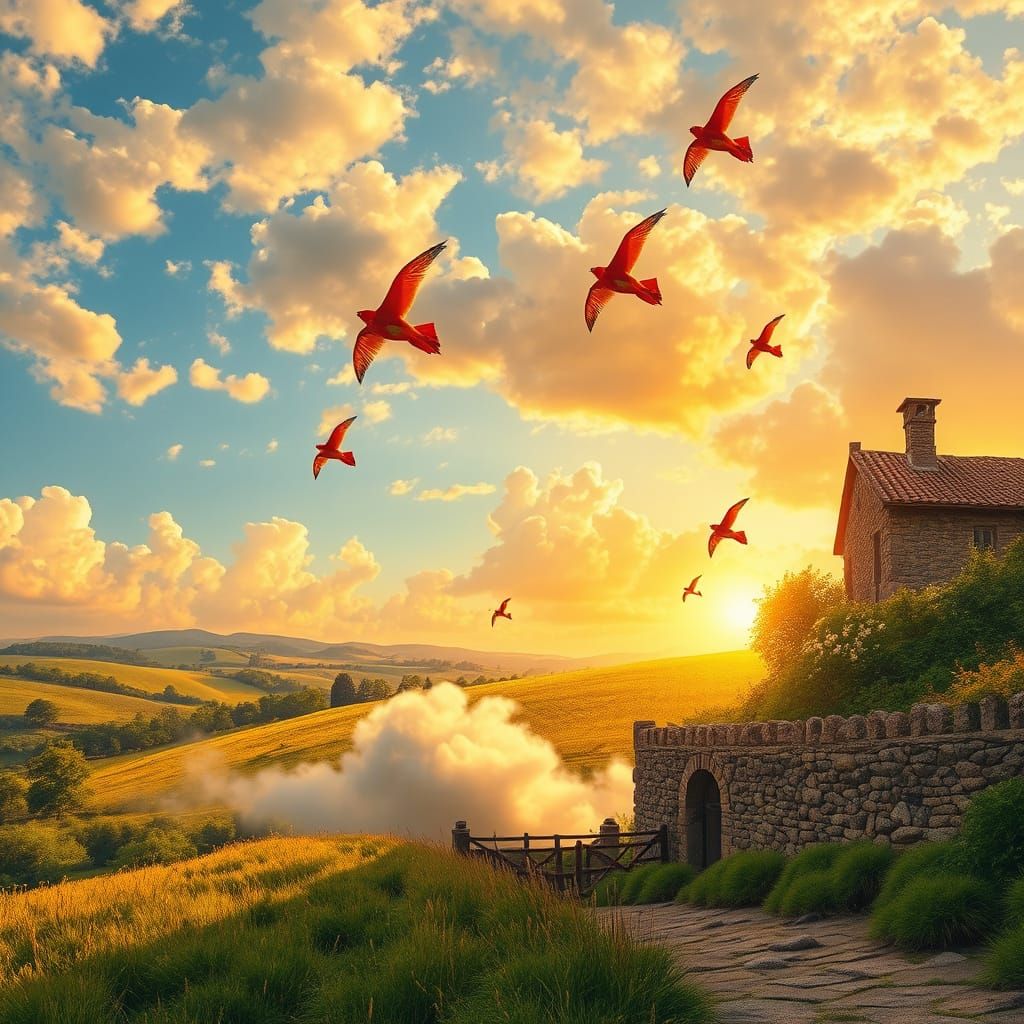 This image captures a peaceful countryside scene with majestic kites soaring in the sky, set against a kaleidoscope of warm golden hues and soft pastel tones, amidst lush greenery and rustic stone walls, rendered in meticulous photorealistic detail