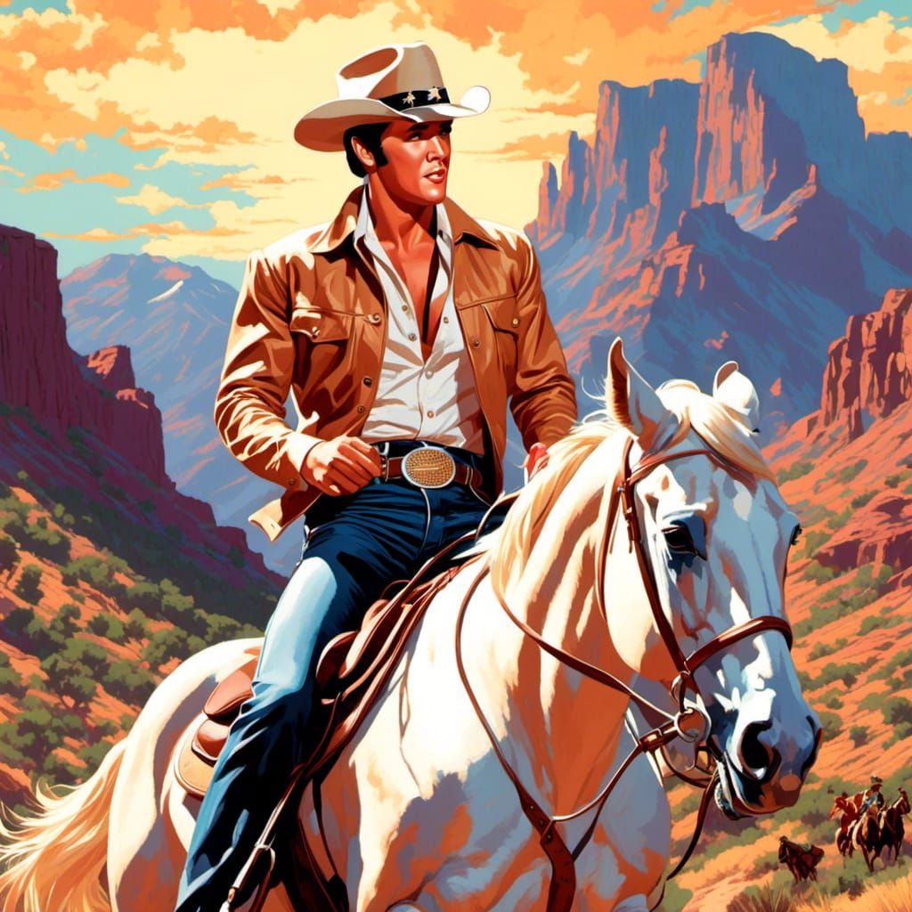 A medium close-up, low-angle shot of Elvis Presley riding a horse through the mountains. He wears a cowboy hat, a white shirt, and a tan jacket, depicted as comic book art.