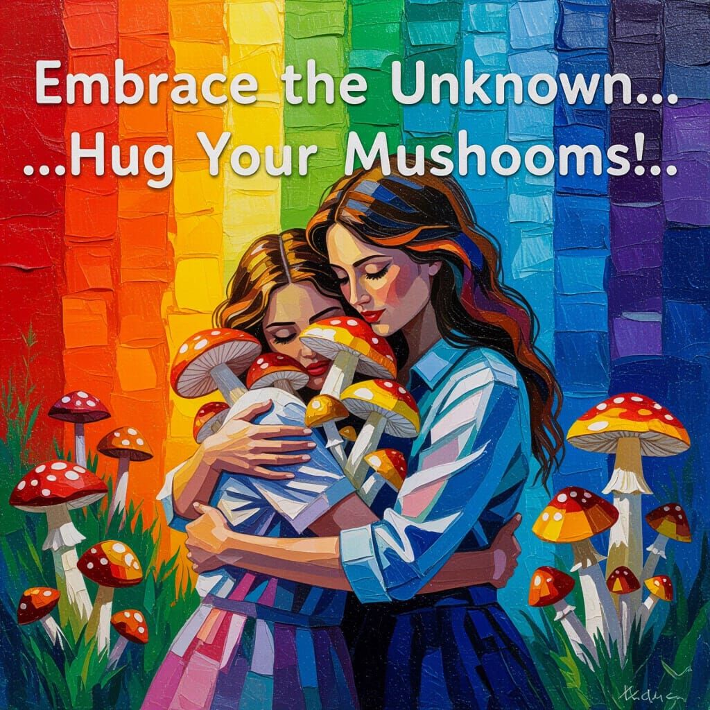 A Fictional painting in the style of Twiggles with in rainbow colors the text: "Embrace the unknown.... Hug your mushrooms"