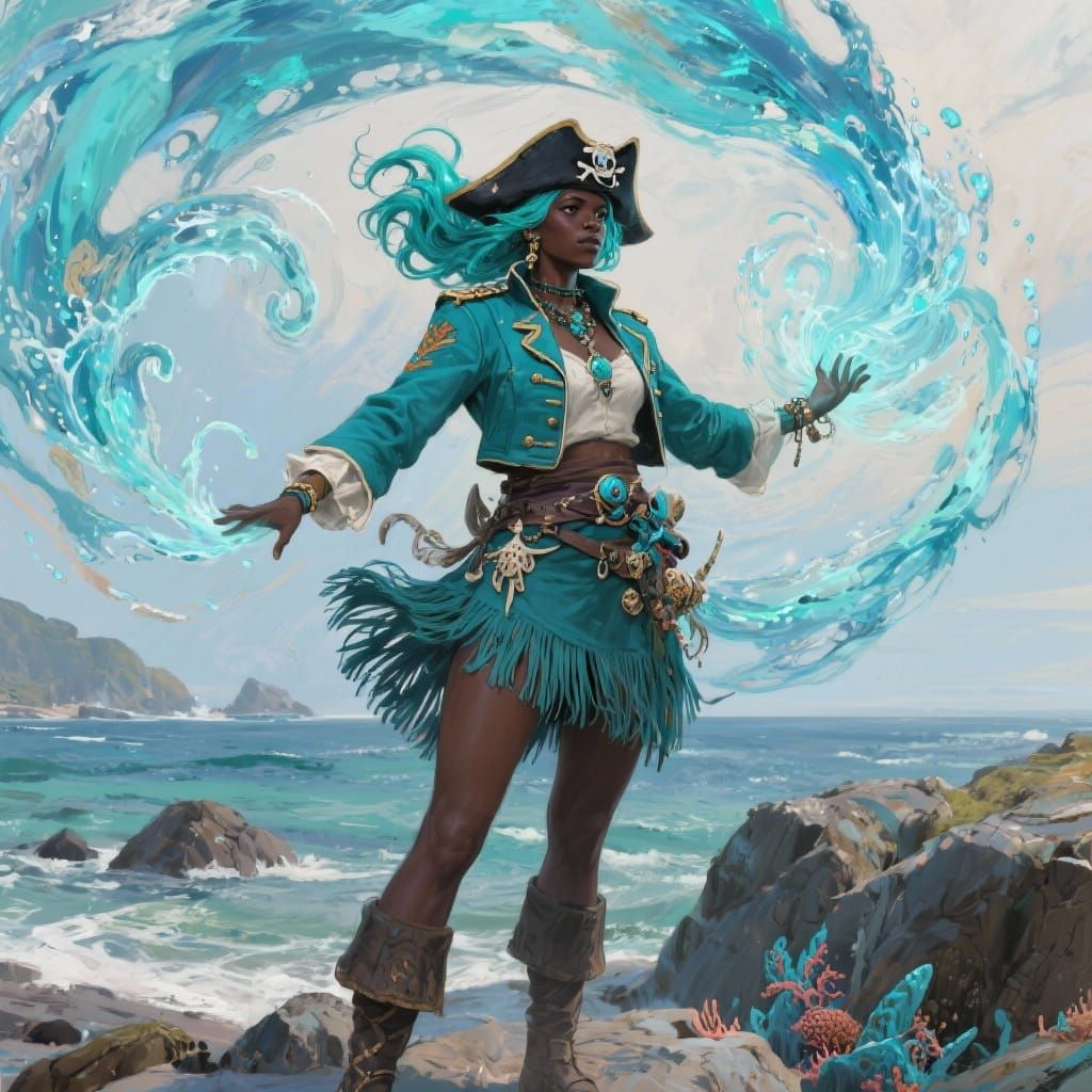 A striking image of a dark-skinned pirate captain with turquoise hair, adorned in a military-style jacket and sea-themed accessories, conjuring swirling sea magic on a rocky coast, rendered with vibrant, dynamic brushstrokes.