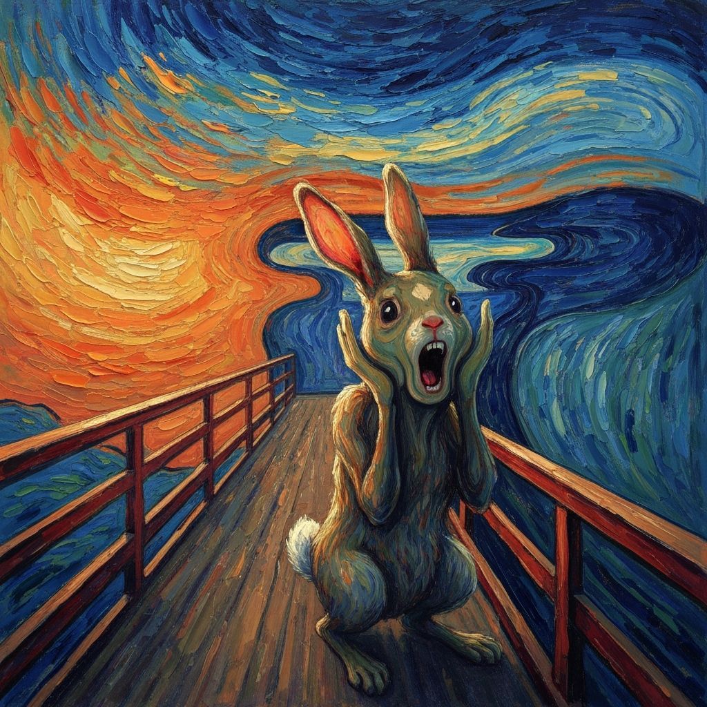 This image depicts a rabbit in distress on a bridge, reminiscent of "The Scream." It features swirling skies in fiery oranges and deep blues, rendered in a vibrant, textured impasto oil style with dramatic lighting.