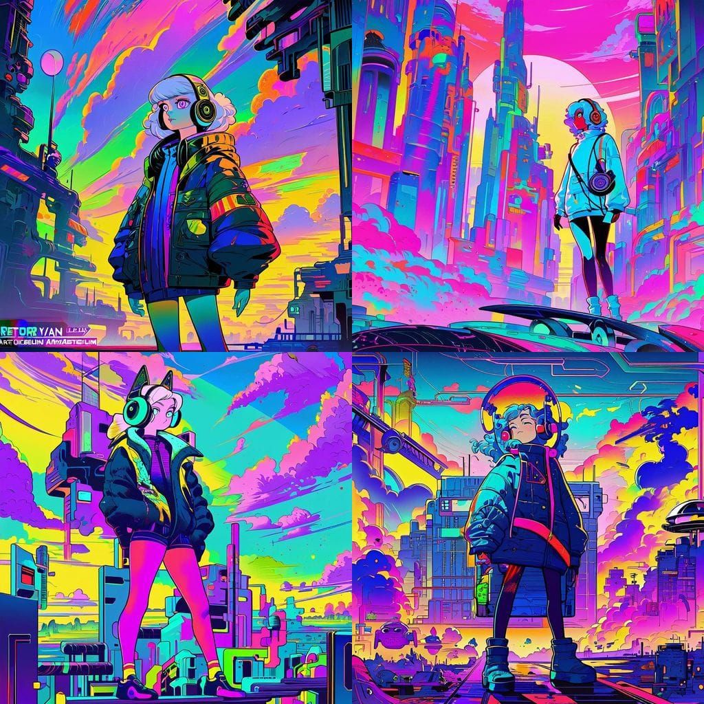 A striking digital painting of a woman with headphones against a cloudy sky. The artwork features soft colors and brushwork in a retrofuturistic, cyberpunk aesthetic.