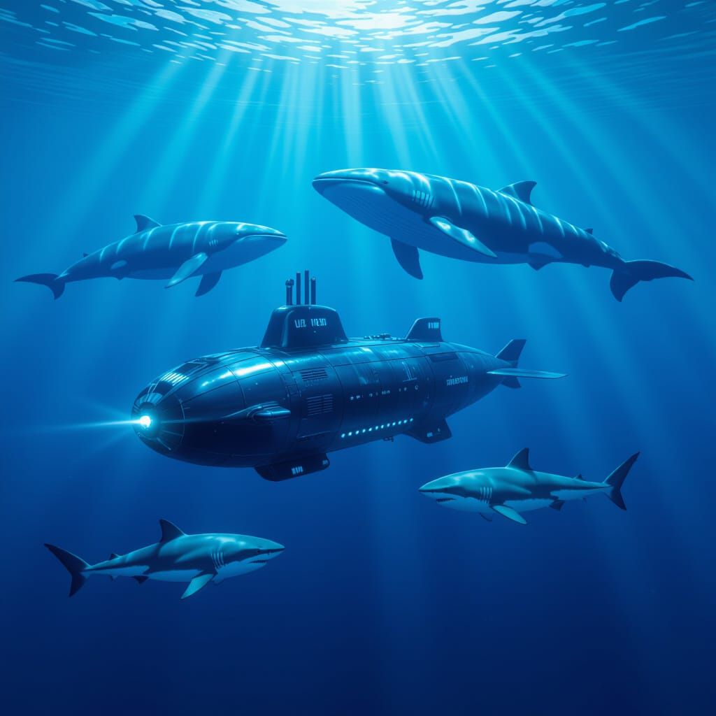 A holographic image of the Nautilus submarine underwater, accompanied by whales and sharks. Light filters down from the surface in this futuristic scene with a detailed aesthetic.